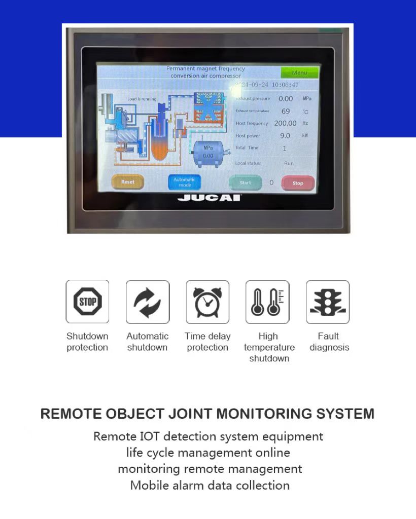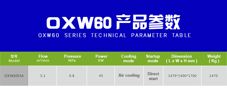 Model:OXW60HA Exhaust volume:5.1 m3/min Compressed medium:Air Working principle:screw air compressor Performance:Low noise, power saving, Oil free environmental protection